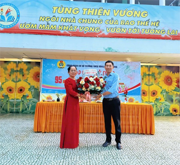 Đại diện công đoàn tặng hoa cho GV nữ